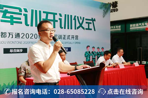 据悉,本次军训将分批次进行,每批次训练周期为10天,在开幕式上,成都万通校长助理谢助对全体学员提出要求,他希望同学们在训练中要遵守纪律,服从指挥,刻苦训练,磨练意志。同时。成都市武装部队教官负责人也对全体教官同样提出要求,希望他们能认真、科学训练,展现军训团队的风貌。
