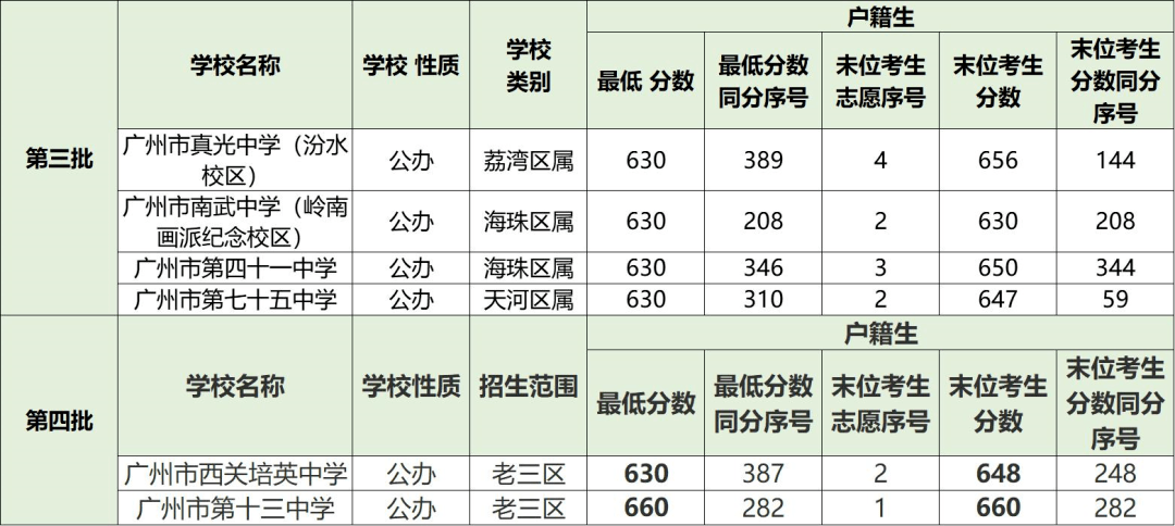 我们可以看一下老三区和天河区部分公办高中的录取情况 1、那些没绝对优势,第三批兜底没拉大分差考虑极端情况而又不重视第四批次填报的学生,这批学生就是所谓 因为志愿填报有...