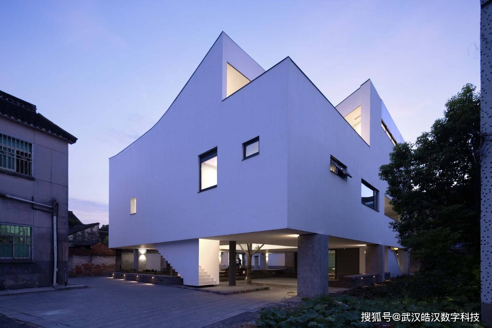 为了能让建筑更有轻盈的漂浮感,减少二层体量压在头顶的压迫感,柱子与架空层顶面的交接处还设置了一段5公分的“小脖子”,看起来像是个减震器,虽然只是个视觉上的“障眼法”...