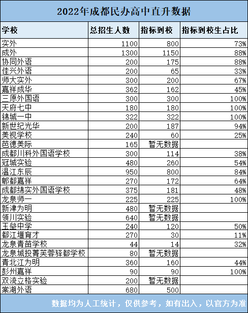 2022年,官方公布了各私立学校的指标到校人数(即直升人数),可以看到,绝大多数私立学校指标到校(校内直升)的占比都极高,甚至不少私立100%都是校内直升,例如天府七中、金苹...